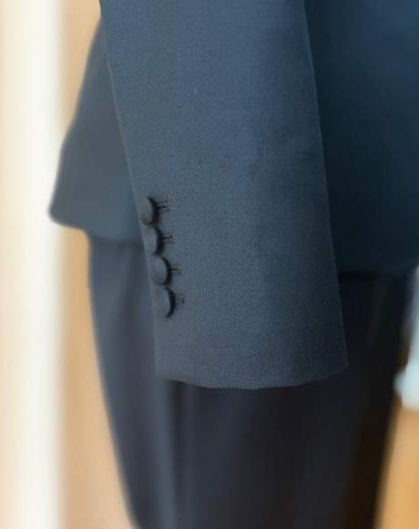 そして、最大のポイントは3つボタンの釦位置です。Vゾーンの余白を狭くし、着丈とのバランスを考え、釦の位置と釦の間隔は指定しています。