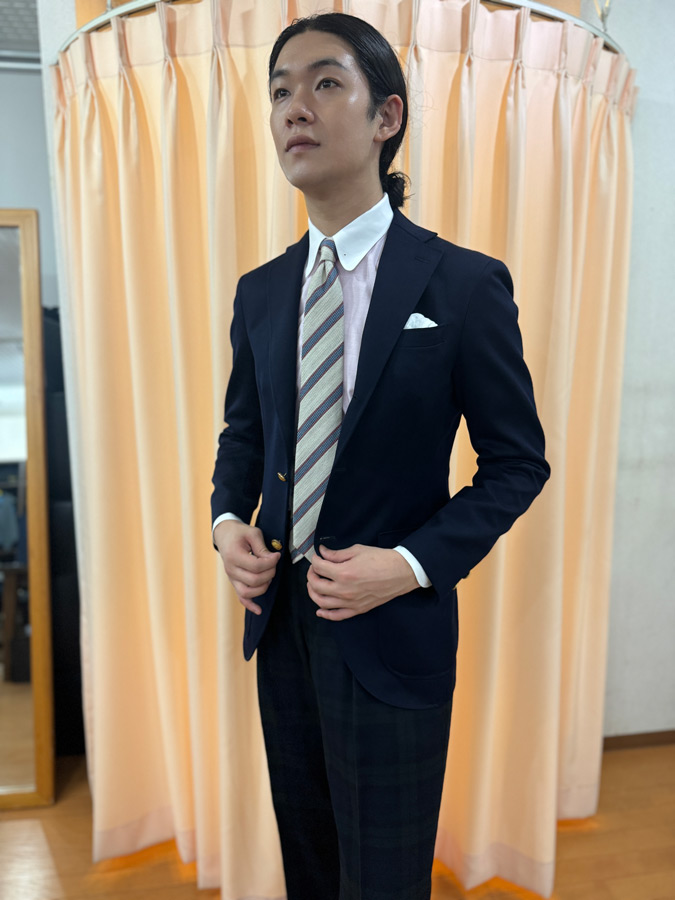“ジャケットの素材感に合わせた生地選び・サイジング” です。
