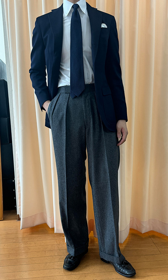 このように、フランネルのジャケットに、一般的な梳毛ウールスラックスを合わせる場合でも、スラックスのシルエットにボリューム感 (ルーズシルエット)を待たせてあげると、どうでしょう。