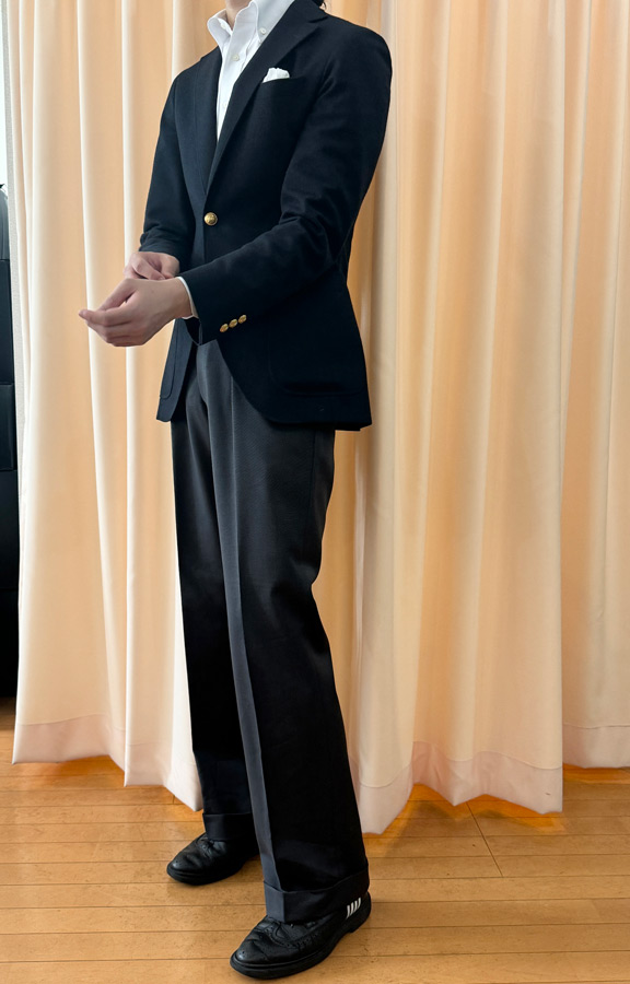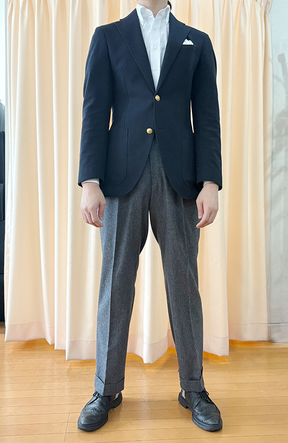 これだと、実際に見てみると、ジャケットの存在感が目立ち過ぎてしまい、上半身にバランスが偏ってしまっているため、非常に野暮ったく見えてしまうのです。