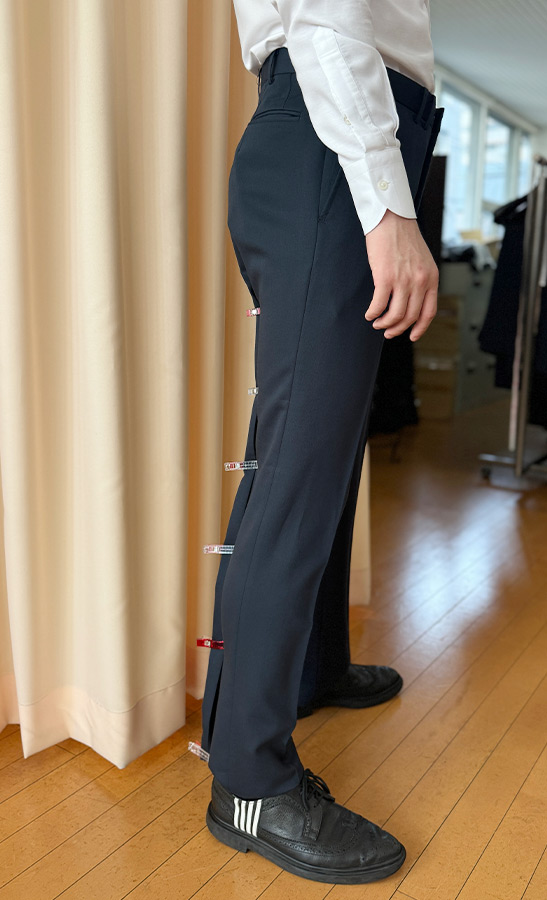 もちろんのこと、その他ウエスト・股上(+体型補正)含め全てがその人にあった黄金比でシルエットを作っていきますので、理想のバランスでスラックスを履くことができるのです。