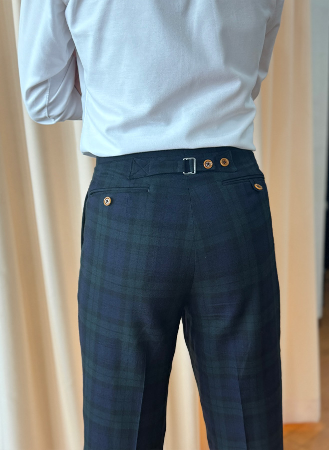 この股上・ヒップ周りのシルエット問題は、自分からは見えない部分なので、より綺麗に美しくスラックスを履くためにも、是非オーダーをオススメいたします。