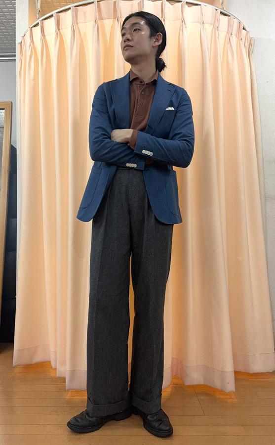 只今、フランネルアイテムをお得にお仕立ていただけるフェアが絶賛開催中!ということで、折角の機会ですから最後に少し、フランネルスラックスを使ったコーディネートをご紹介したいと思います!