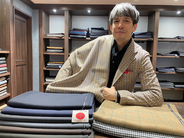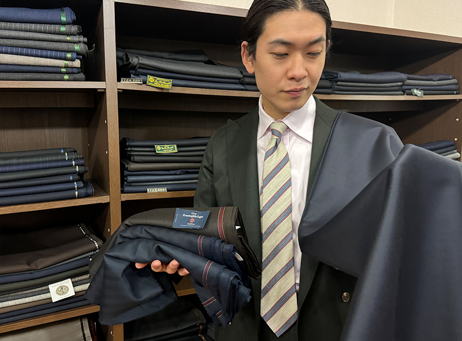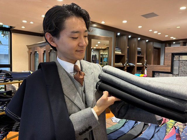 というのは、今まではやはりこのラインは、ビジネススーツや入学式などの式典用スーツ、リクルート用といったベーシックなものをお選びになる方が多かったのですが、最近は人と被らないような1着、お洒落スーツ用としてお選びになる方が増えてきました。