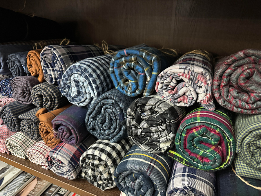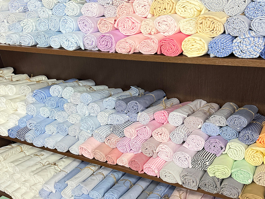 無地系のカラーバリエーションはもちろんのこと、色とりどりのストライプや大胆なチェックなどなど、とにかくどのランクのシャツ生地よりも幅がひろく仕立てがいのある生地が選り取り見取り。