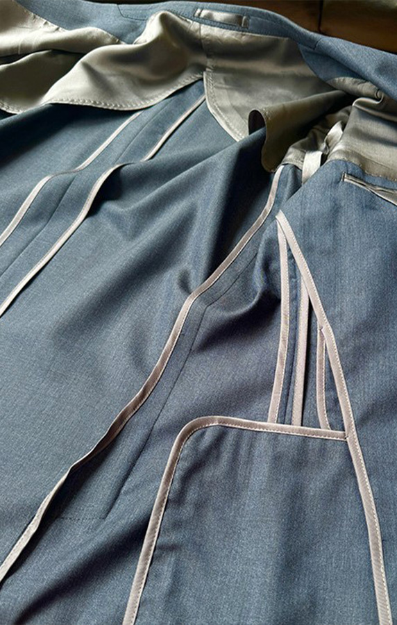見返し部分に表地を多く取っていることで、立体的なシルエットを形成してくれるとともに、動くたびに綺麗になびくドレープを演出してくれますので、サマータイム本来の光沢を最大限引き出してくれるのです。