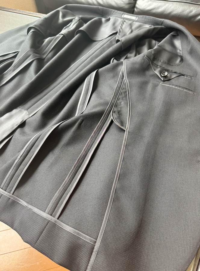 その構造は、背抜き仕様からさらに脇の下から裾までの細かい部分までも裏地を無くした仕立てになります。