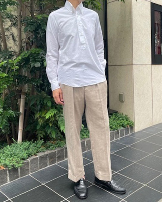 また夏場であれば、スラックスを単品使いして、カットソーや半袖シャツにスニーカーを合わせるだけでも十分サマになります。