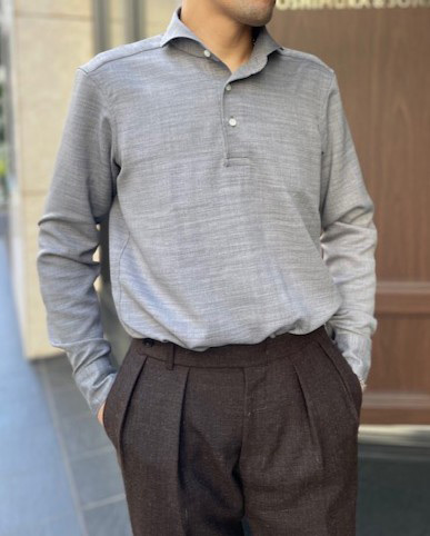 例えば、昨年リリースされた〈ドレスポロシャツ〉に、今季リリースされた〈カプリシャツ〉&〈バンドカラー〉など、ビジネス~プライベートシーンまで楽しめるカジュアルライクなシャツ も大変人気であります。