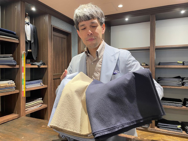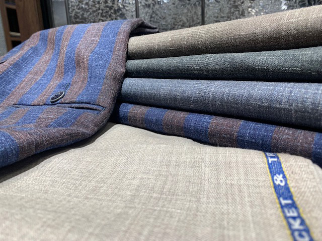 当店でも春夏には非常に人気があり、スーツやジャケット&パンツスタイルなど、フルアイテムのお仕立てに適した素材です。