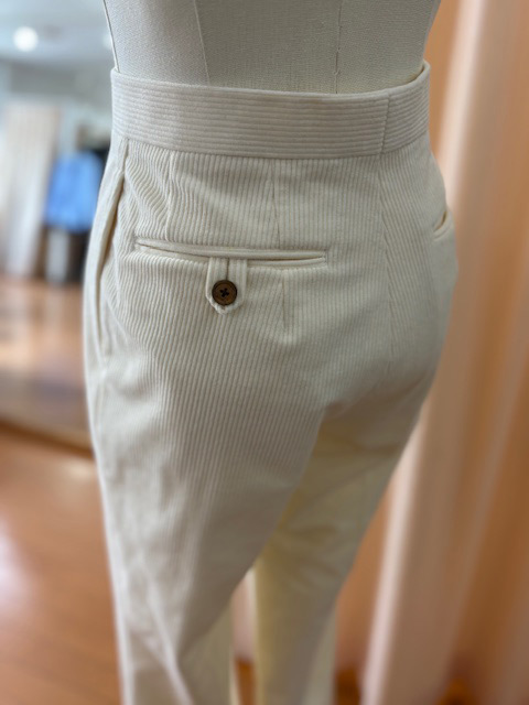 続きまして、スラックスです。こちらも機能性素材のホワイトのコーデュロイ(ポリエステル100%)でお仕立ていただきました。 コットンのコーデュロイに比べて、畝が細く、ソフトで軽めなタッチです。仕上がりは、チープさは感じられず、とても上品な仕上がりです。 デザインの特徴は、ベルトレスで釦はナット釦を使用。そしてワイドでストレートなシルエットです。 ストレッチ性もあり、気軽に洗えることが、日常で着るスラックス用としては非常に嬉しい点ですね。