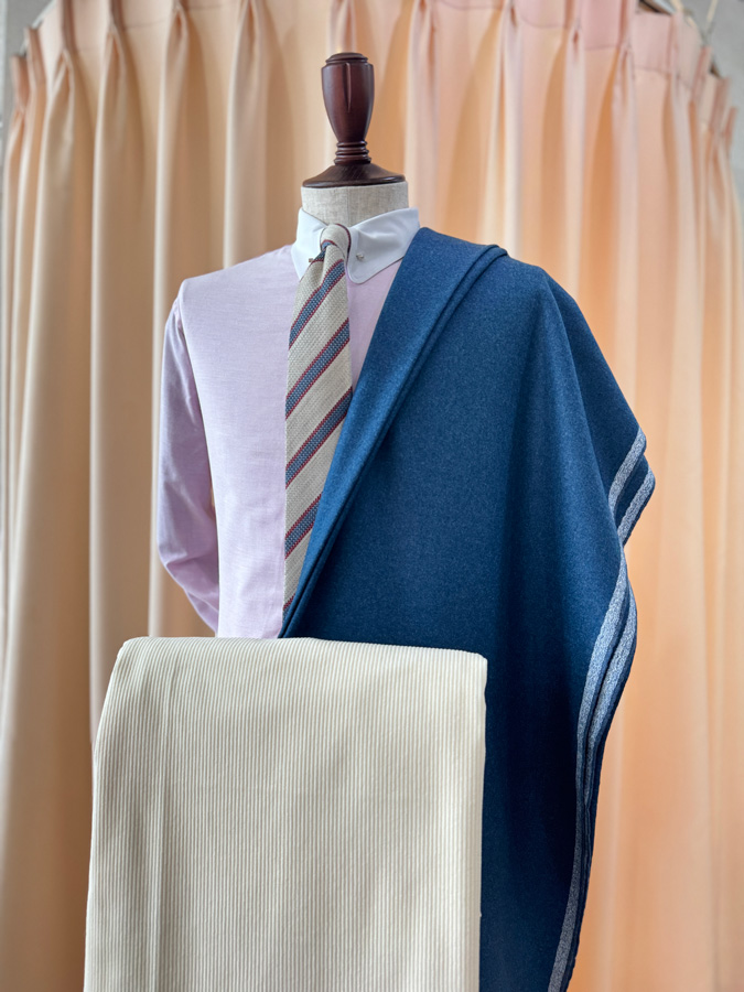 いうことで、ジャケットは〈CACONICO Super100’sフランネル/ブルー〉、スラックスは〈8Wトリコットコーデュロイ/ホワイト〉をチョイス。