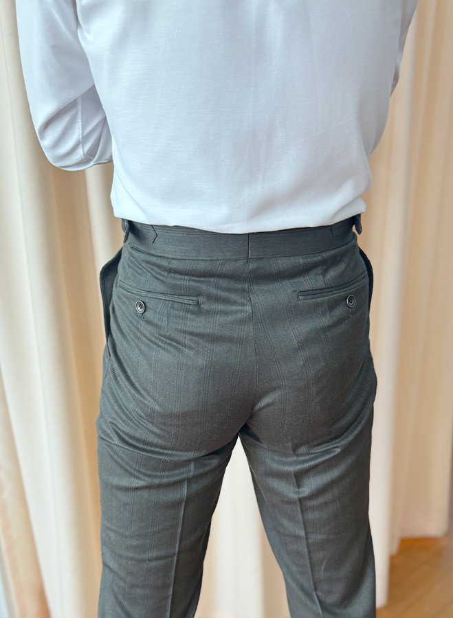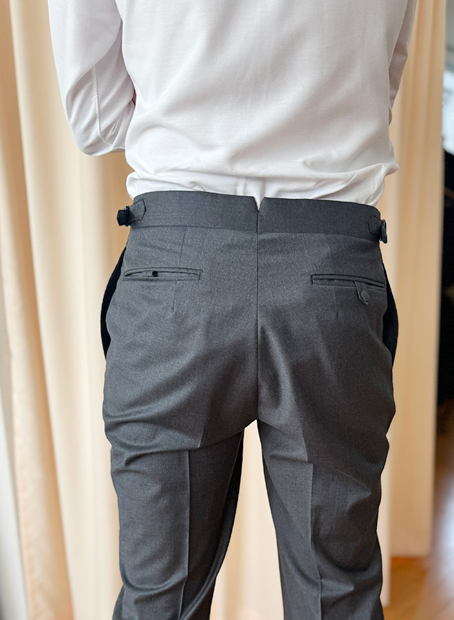 この股上・ヒップ周りのシルエット問題は、自分からは見えない部分なので、より綺麗に美しくスラックスを履くためにも、是非オーダーをオススメいたします。