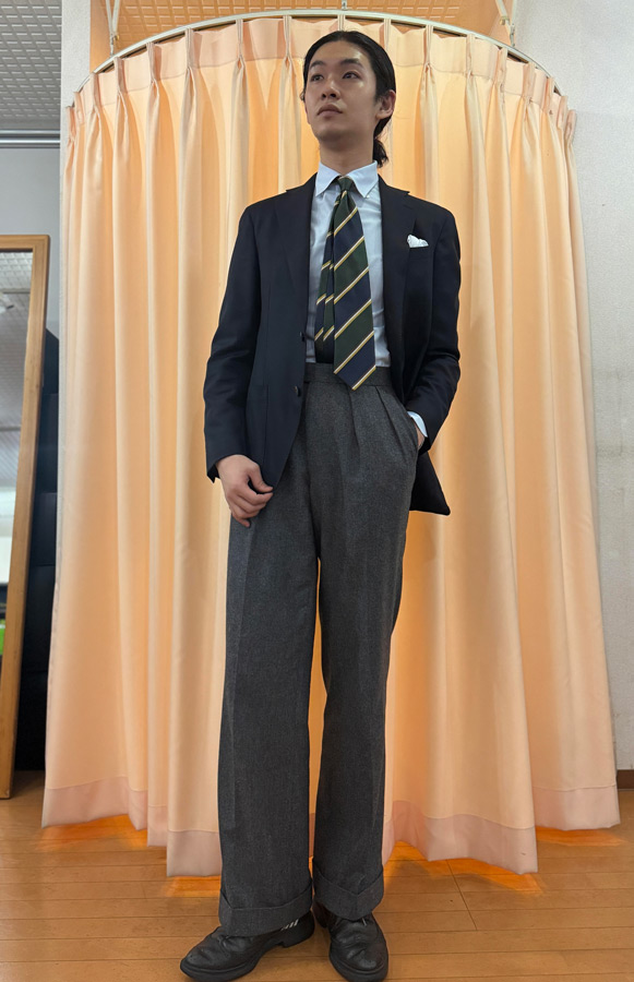 只今、フランネルアイテムをお得にお仕立ていただけるフェアが絶賛開催中!ということで、折角の機会ですから最後に少し、フランネルスラックスを使ったコーディネートをご紹介したいと思います!