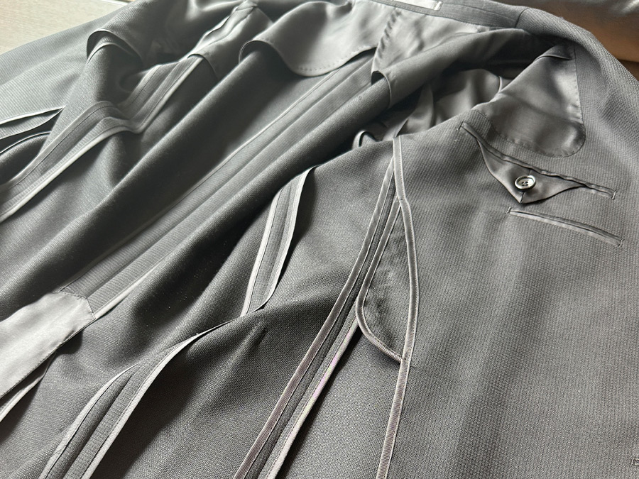 見返し部分に表地を多く取っていることで、立体的なシルエットを形成してくれるとともに、動くたびに綺麗になびくドレープを演出してくれますので、サマータイム本来の光沢を最大限引き出してくれるのです。