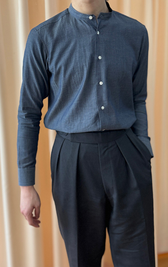 シャツパンツスタイルでも完成度の高いスタイリングとなるキーは、まさにこの光沢が控えめのドライな生地感でパンツを仕立てることです。