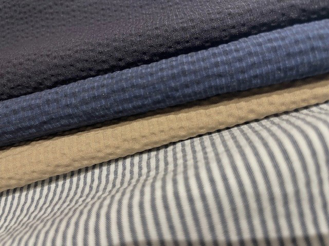 昨年も大変人気であった、EVALET サッカーのご紹介です。こちらは、バネのような伸縮性があり、他の機能性素材と比べてもストレッチ性が高い素材です。また、サッカー生地の特徴である凹凸があると生地が肌に張り付くことがなく、涼しく感じます。