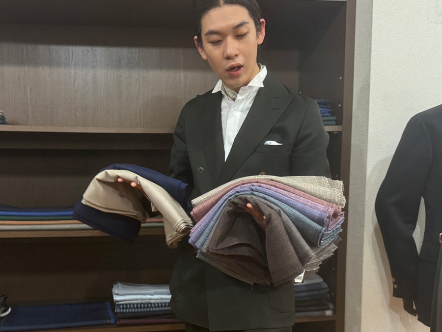 当店でも春夏には非常に人気があり、スーツやジャケット&パンツスタイルなど、フルアイテムのお仕立てに適した素材です。