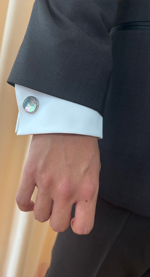 タキシードのYシャツだと、よくフロントに3つ(or4つ)飾りのボタンを付けるスタッドボタンや、ヒダ胸(プリーツ)仕立てが多いですが、これらはかなり本格的であり、畏まった印象になるため、今回は敢えてフォーマル感がありつつ簡易的な比翼仕立てをチョイス。