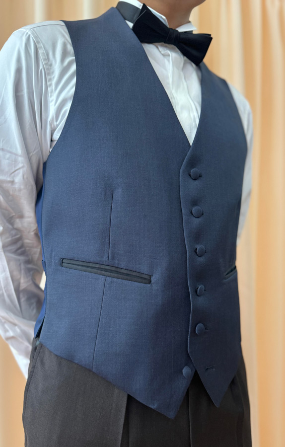 ベストの腰ポケットの玉縁も黒で指定し、タキシードとの統一感を出しております。